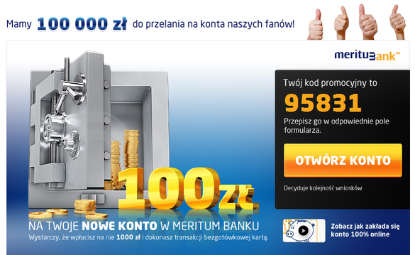 Meritum Bank oferuje fanom swojego profilu na portalu społecznościowym Facebook 100 zł premii za założenie konta. Dzięki wprowadzonemu niedawno rozwiązaniu Bank umożliwia otwarcie rachunku nawet w 15 minut, bez konieczności podpisywania dokumentów dostarczonych przez kuriera i bez wizyty w placówce.