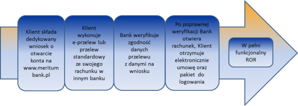 Otwarcie konta osobistego w Internecie bez konieczności czekania na kuriera czy wizyty w placówce jest możliwe dzięki zastosowaniu nowoczesnej, elektronicznej metody weryfikacji tożsamości klienta. Potwierdzana jest ona poprzez wykonanie przez klienta przelewu z banku, w którym dotychczas prowadził rachunek. Meritum Bank sprawdza zgodność danych klienta wpisanych przez niego we wniosku o otwarcie rachunku z danymi klienta na przelewie przychodzącym z innego banku.
