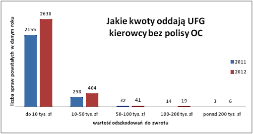 W 2012 roku UFG prowadził łącznie 19,4 tysiąca spraw o zwrot odszkodowań wypłaconych ofiarom wypadków spowodowanych przez kierowców bez OC, również w latach poprzednich.
