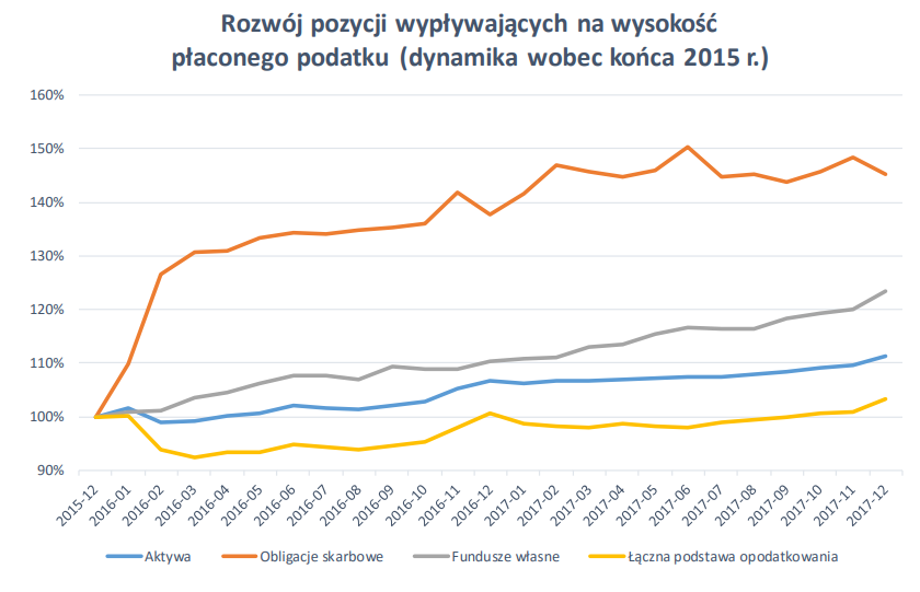 Z podstawy opodatkowania wyłączone są m.in. obligacje skarbowe. Komisja zwraca uwagę, że miesiąc przed wprowadzeniem podatku pozycja ta w bilansach banków wzrosła aż o 45 proc. W ujęciu ilościowym jest to zmiana portfela o 71,0 mld zł. W tym samym okresie aktywa wzrosły o 11 proc. (133,8 mld zł), a łączna podstawa opodatkowania o 3 proc. (26,9 mld zł). Miesięczne wpłaty z tytułu podatku oscylowały w granicach 298,8 mln zł – 314,5 mln zł.