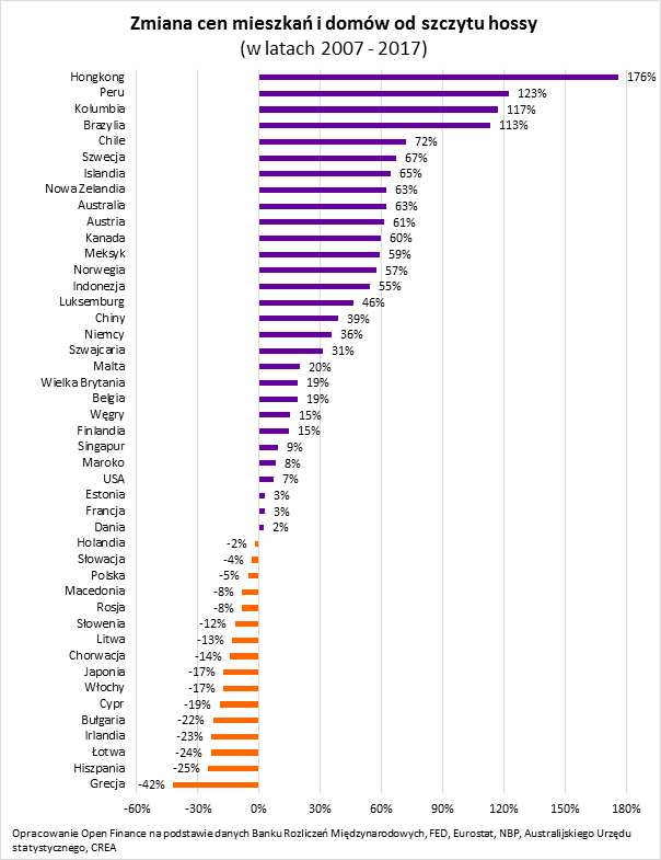 Takiego stanu rzeczy mogliby jedynie pozazdrościć Norwegowie, Szwedzi, Islandczycy, Austriacy, Australijczycy czy Kanadyjczycy. Ci muszą dziś płacić za „dach nad głową” o około 60% więcej niż dekadę temu. Mało tego, można znaleźć też bardziej egzotyczne kraje, w których ceny w ciągu 10 lat przynajmniej się podwoiły. Z takim problemem muszą dziś mierzyć się mieszkańcy Hongkongu, Peru, Kolumbii czy Brazylii. W pierwszym przypadku winne są braki mieszkaniowe. Boom w Peru, Kolumbii i Brazylii wywołany jest przez wiele czynników takich jak dynamiczny rozwój turystyki, wzrost gospodarczy, przemiany polityczne, programy rządowe (dopłaty) czy łatwiejszy dostęp do kredytów hipotecznych. Portal Global Property Guide podkreśla jednak, że we wspomnianych krajach rynek hipoteczny wciąż jest relatywnie niewielki, a więc za boom mieszkaniowy nie można obwiniać jedynie łatwiejszego dostępu do kredytów.