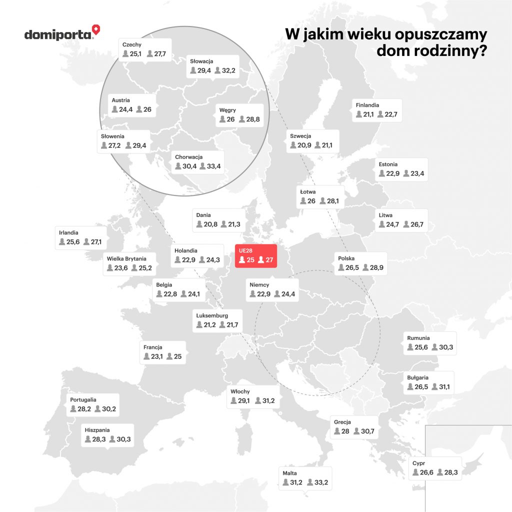 Według danych Eurostatu, najdłużej w rodzinnych domach pozostają obywatele Chorwacji, Malty i Słowacji – niezależnie od płci na wyprowadzkę decydują się dopiero około 30. roku życia. Na drugim biegunie plasują się mieszkańcy północnej Europy, czyli Duńczycy, Norwegowie i Szwedzi, którzy “na swoje” przenoszą się w wieku 20-22 lat.