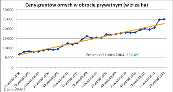 Część kapitału można też zainwestować w ziemię rolną. Ta od ponad 7 lat nieprzerwalnie drożeje. Pod koniec 2004 roku przeciętny hektar kosztował niecałe 7 tys. zł. Dziś jest to ponad 25 tys. zł. Wzrost sięgnął prawie 270%, choć nie można zapominać, że w wielu przypadkach inwestowanie w ziemię rolną nie polega jedynie na tym, żeby ziemię przeznaczoną do produkcji rolnej kupić i jako tak samo przeznaczoną sprzedać z zyskiem. Znacznie większych źródeł dochodu inwestorzy upatrują bowiem w zmianie przeznaczenia nieruchomości z rolnego np. na budowlany lub podziale dużego areału na mniejsze działki w myśl zasady, że im mniejsza sprzedawana nieruchomość, tym wyższa jej cena w przeliczeniu na metr. Wzrost wartości nieruchomości rolnej może być też konsekwencją budowy infrastruktury np. dróg ekspresowych czy autostrad, obwodnic, mostów itp. Wraz bowiem ze skracaniem czasu potrzebnego na dojazd z danej nieruchomości do centrum dużego miasta rośnie cena za metr ziemi. Takie trafione inwestycje potrafią generować wyższe stopy zwrotu niż obserwowane dotychczas roczne wzrosty cen gruntów rolnych.