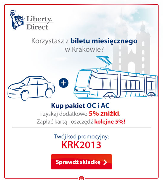 Liberty Direct rusza z promocją skierowaną do kierowców samochodów, którzy korzystają również z komunikacji publicznej. Osobom posiadającym bilet miesięczny w Krakowie firma oferuje 5% zniżki na zakup pakietu ubezpieczeń OC i AC. Dodatkowe 5% rabatu na polisy można otrzymać, płacąc kartą kredytową.