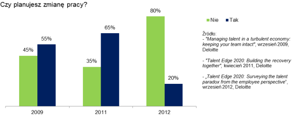 „Cztery piąte badanych nie zamierza szukać nowej pracy, a jednocześnie duża część z nich nie jest zadowolona z wykonywanego zajęcia. Z czego wynika ten paradoks i odwrócenie proporcji na rynku pracy? Z pogarszającej się sytuacji gospodarczej, która powoduje mniejszą skłonność do ryzyka, a przez to wstrzymanie się z podejmowaniem kluczowych decyzji o odejściu z dotychczasowej firmy” – wyjaśnia Aneta Woźny, starszy konsultant z działu konsultingu Deloitte. – „Jednak rosnące bezrobocie nie powinno usypiać czujności pracodawców, którzy mogą mieć złudne przekonanie, że nie stracą najlepszych i najbardziej utalentowanych osób. Nasze badanie wyraźnie pokazuje, że zaniedbywany i niezadowolony pracownik wcześniej czy później będzie dążył do zmian w swojej karierze – ostrzega Aneta Woźny.