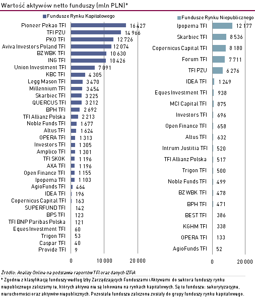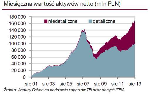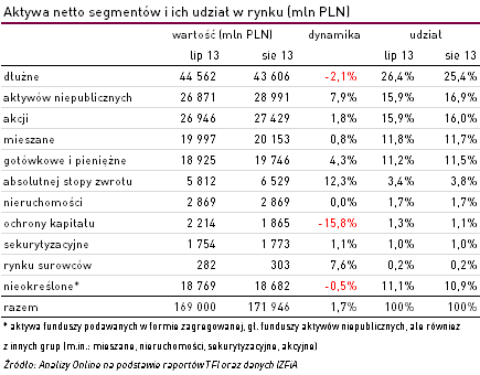 Największą dynamikę zmian wartości zarządzanych aktywów odnotowały fundusze absolutnej stopy zwrotu. Głównie dzięki udanej subskrypcji na nowy fundusz PKO TFI, wartość aktywów tego segmentu wzrosła aż o +12,3%, przekraczając na koniec sierpnia poziom 6,5 mld zł. Wysoką, blisko +8% dynamikę odnotowały również fundusze aktywów niepublicznych oraz fundusze rynku surowców. Segment funduszy aktywów niepublicznych, dzięki wpłatom prywatnych inwestorów do kilku dedykowanych rozwiązań, zgromadził na koniec sierpnia blisko 29 mld zł. W przypadku funduszy surowcowych, o wysokim tempie przyrostu środków zadecydowały wzrosty notowań złota na światowych giełdach, dzięki czemu fundusze operujące na tym rynku wypracowały przyzwoite wyniki.
