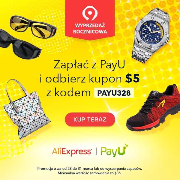 Promocja jest kontynuacją rozpoczętej w 2017 roku współpracy między obiema firmami. Aby z niej skorzystać wystarczy wprowadzić kod PAYU328 w aplikacji AliExpress podczas płatności za pomocą PayU. Dzięki temu każdy klient, który złożył zamówienie powyżej 35 USD otrzyma rabat w wysokości 5 USD. Oferty w ramach Wyprzedaży rocznicowej można znaleźć TUTAJ.