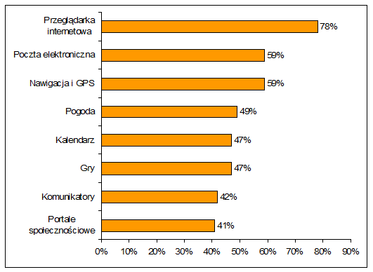 Blisko 80% internautów posiadających smartfony korzysta z aplikacji. Największa grupa osób (46%) pobiera aplikacje bezpłatne, natomiast 32% – zarówno płatne jak i bezpłatne. Najpopularniejszymi aplikacjami są: przeglądarka internetowa, poczta elektroniczna oraz nawigacja i GPS. Tylko co dziesiąty internauta posiadający smartfona chętnie wróciłby do tradycyjnego telefonu – wynika z badania ARC Rynek i Opinia.
