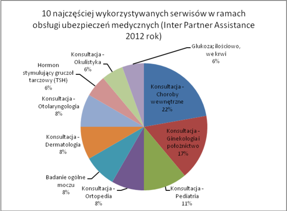 W 2012 roku najbardziej popularnymi świadczeniami z zakresu opieki medycznej jakie realizowaliśmy na rzecz Klientów Towarzystw Ubezpieczeniowych to konsultacje lekarskie w zakresie chorób wewnętrznych, ginekologii i położnictwa oraz pediatrii.