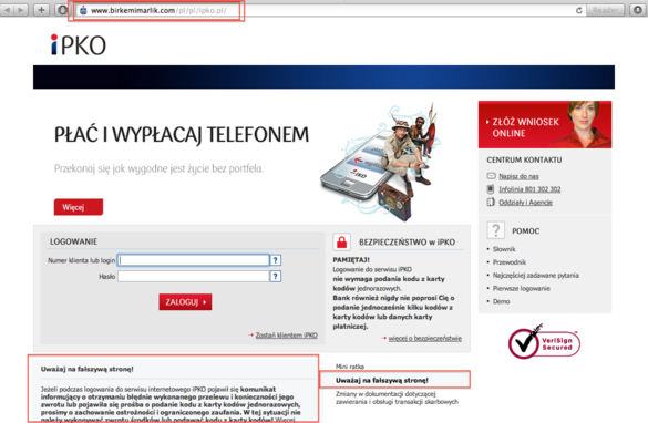 Oszuści sklonowali stronę logowania do systemu transakcyjnego iPKO. Ze względu na to, że kod jest pobierany „na żywo”, poza adresem strony nie ma praktycznie sposobu na odróżnienie obu witryn. Kopia jest tak dokładna, że na witrynie oszustów znalazł się nawet komunikat ostrzegający przed nimi samymi, publikowany na prawdziwym ipko.pl!