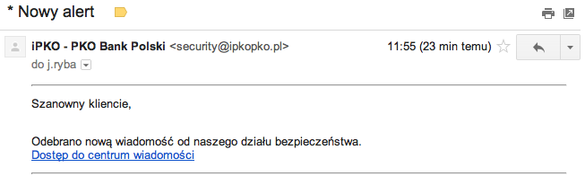 „W Internecie pojawiły się fałszywe e-maile z prośbą o odczytanie wiadomości przesłanej przez Bank. Nadawca prosi o kliknięcie w odnośnik przekierowujący do fałszywej strony z prośbą o zalogowanie i podanie kodów z karty kodów. Informujemy, że PKO Bank Polski nie jest autorem tych wiadomości, zostały one wysyłane przez osoby podszywające się pod Bank. Przypominamy o zachowaniu ostrożności i ograniczonego zaufania w stosunku do e-maili, w których znajduje się prośba o podanie poufnych danych. Podkreślamy, że Bank nigdy nie prosi o przekazywanie jakichkolwiek danych drogą mailową.”.