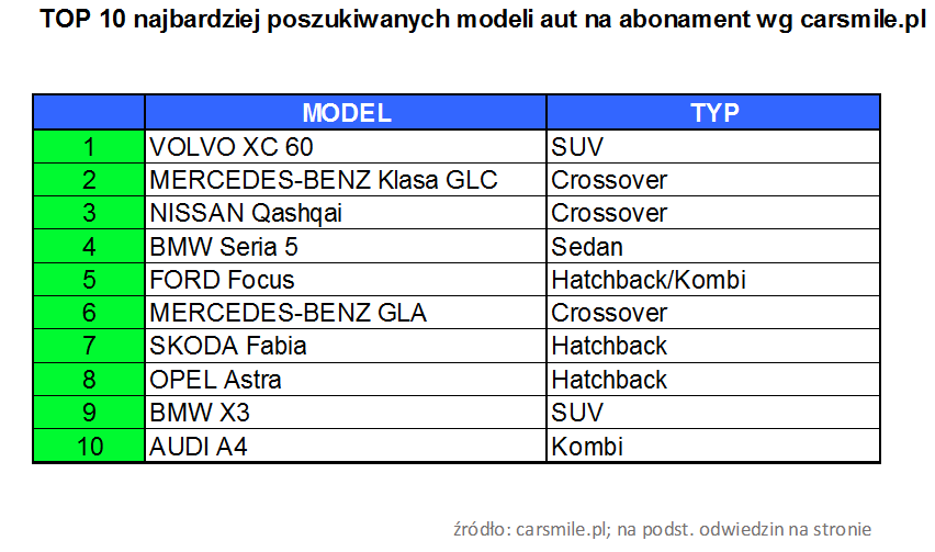 Na liście TOP 10 najbardziej poszukiwanych aut znalazły się Volvo XC 60, dwa modele Mercedesa (GLC i GLA), dwa modele BMW (5 i X3). Gdyby nie Skoda Fabia i Opel Astra, lista ta nie miałaby nic wspólnego z zestawieniem TOP 10 najchętniej kupowanych samochodów przez Kowalskiego, jaką sporządza Samar. Bez przesady można więc powiedzieć, że najem pozwala Polakom sięgać po auta z wyższej półki niż w przypadku zakupu na własność.