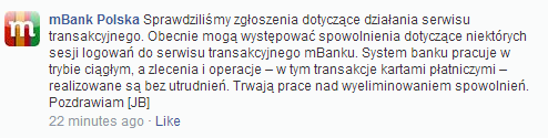 Sprawdziliśmy zgłoszenia dotyczące działania serwisu transakcyjnego. Obecnie mogą występować spowolnienia dotyczące niektórych sesji logowań do serwisu transakcyjnego mBanku. System banku pracuje w trybie ciągłym, a zlecenia i operacje – w tym transakcje kartami płatniczymi – realizowane są bez utrudnień. Trwają prace nad wyeliminowaniem spowolnień – napisał administrator fanpagea mBanku.