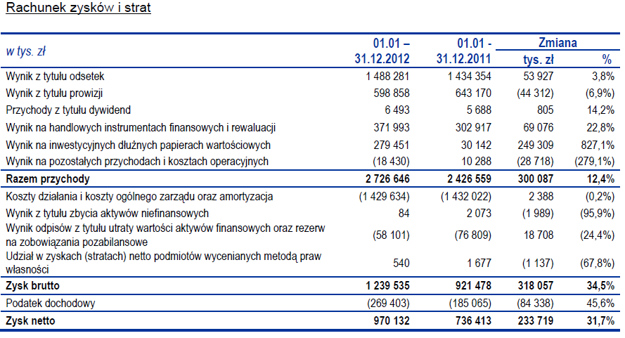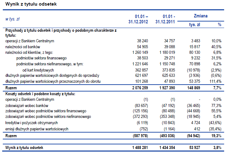 • wynik z tytułu odsetek w wysokości 1 488,3 mln zł wobec 1 434,4 mln zł w 2011 roku (wzrost o 53,9 mln zł, tj. 3,8%), przede wszystkim za sprawą wyższych przychodów od kredytów klientowskich, co było pochodną przede wszystkim istotnego wzrostu wolumenów kredytów korporacyjnych. W 2012 roku odnotowano również wzrost odsetek od dłużnych papierów wartościowych przeznaczonych do obrotu. Z drugiej strony, w 2012 roku nastąpił wzrost kosztów odsetkowych, głównie z tytułu zobowiązań wobec podmiotów sektora finansowego i banków;