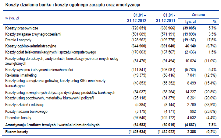 niższych kosztów usług zewnętrznych dotyczących dystrybucji produktów bankowych, niższych kosztów doradczych oraz mniejszych nakładów na reklamę i marketing. Jednocześnie należy zwrócić uwagę, iż w I kwartale 2012 roku, w ciężar kosztów utworzona została rezerwa restrukturyzacyjna w wysokości 42,2 mln zł (z czego 32,4 mln zł ujęte było w linii kosztów pracowniczych, natomiast 9,8 mln zł w linii kosztów wynajmu i utrzymania nieruchomości);