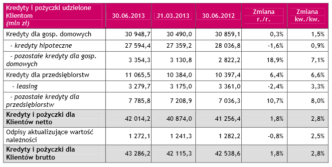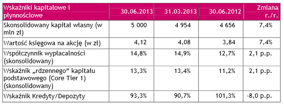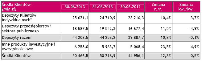 Na dzień 30 czerwca 2013 depozyty klientów wyniosły 44 209 mln zł i wzrosły o 4 321 mln zł czyli 10,8% w stosunku do 30 czerwca 2012 r. oraz pozostały na po dobnym poziomie, jak w marcu 2013 roku.