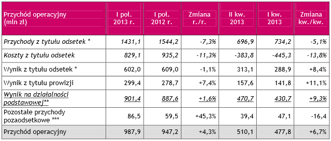 Wynik na działalności podstawowej, zdefiniowany jako suma wyniku z tytułu odsetek i p rowizji netto, wyniósł 901,4 mln zł i wzrósł o 1,6% w porównaniu d o wyniku osiągniętego w I połowie 2012 r. oraz o 9 ,3% w porównaniu z I kw. 2013 roku.
