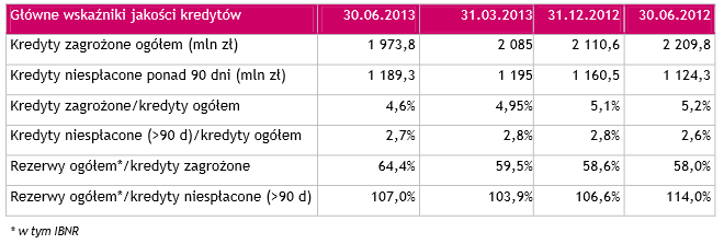 Poprawie jakości portfela kredytowego Grupy towarzy szyło utrzymanie poziomu rezerw na pokrycie utraty wartości portfela kredytowego tworzonych w rachunku wyników. W konsekwencji powyższego poprawił się istotnie poziom pokrycia rezerwami kredytów zag rożonych utratą wartości i w czerwcu 2013 r. wyniós ł on 64,4%, w porównaniu z poziomem około 58% w grudn iu i czerwcu 2012 roku. Wskaźnik pokrycia rezerwami kredytów niespłaconych (ponad 90 dni) pozostawał na koniec czerwca 2013 roku na wysokim poziomie 107%.