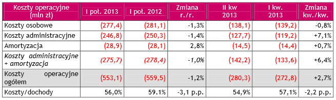 Koszty ogółem w I połowie 2013 r. wyniosły 553,1 zł, co oznacza i ch spadek o 1,2% w porównaniu do I połowy 2012 r. W II kw. 2013 r. koszty ogółem osiąg nęły 280,3 mln zł i były wyższe o 2,7% od kosztów zrealizowanych w I kw. 2013 roku (272,8 mln zł) z p owodu wyższych pozostałych kosztów administracyjnych.