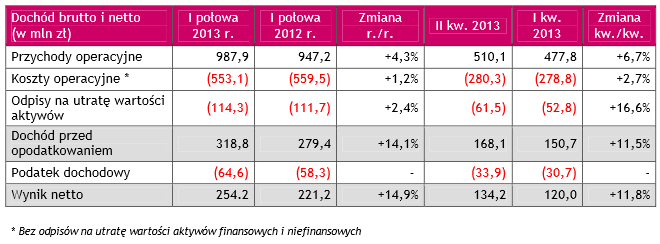 Wynik przed opodatkowaniem w I połowie 2013 r. wyniósł 318,8 mln zł, co oznacz a wzrost o 14,1% w porównaniu do wyniku brutto osiągniętego w I połowi e 2012 roku. Wynik netto w analizowanym okresie wzrósł do 254,2 mln zł i był wyższy o 14,9% w porów naniu do osiągniętego w I połowie 2012 r. Wynik ten wzrósł dzięki wyraźnie wyższej wartości przychodów operacyjnych ( o 4,3% r/r), skutecznej kontroli kosztów („1,2% r/r) i podobnemu poziomowi odpisów n a ryzyko. W ujęciu kwartalnym, zysk netto w II kw.2013 r. wyniósł 134,2 mln zł i wzrósł o 11,8% w porównaniu z I kw. 2013 r. Jest to najwyższy poziom zysku kwartalnego jaki Bank osiągnął w swojej histo rii, jeżeli pominiemy wynik osiągnięty w IV kw.2005 r. zawierający jednorazowe zyski kapitałowe.