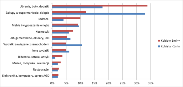 Porównując wydatki kobiet zamożnych i tych o niższych dochodach, największe różnice można zauważyć w wydatkach na ubrania, dodatki i buty oraz na zakupy w supermarketach i sklepach spożywczych. Relacje wydatków są tu niemal odwrotne. Istotne różnice widać też w stosunku do zaspokajania potrzeb z wyższej półki. W budżecie zamożnych kobiet istotną pozycję w wydatkach stanowią podróże – 10% i biżuteria – 4%. Wśród kobiet o niższych dochodach jest to odpowiednio 4 i 1%.