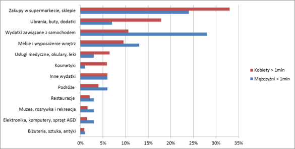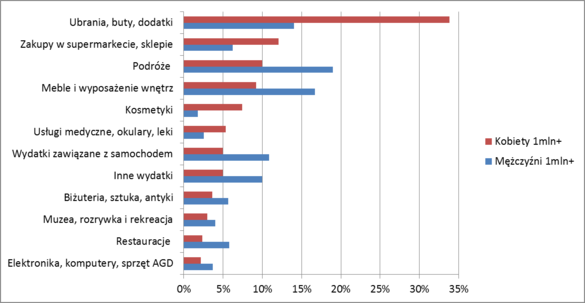Po stronie wydatków kobiety i mężczyźni prezentują odmienne zachowania. Wśród najzamożniejszych kobiet największą część wydatków stanowią ubrania, dodatki oraz buty – aż 34%. Panie wydają na ten cel ponad dwukrotnie więcej niż równie zamożni mężczyźni. Milionerki dwukrotnie więcej wydają również na zakupy w supermarketach i sklepach spożywczych (12% vs 6%) i ponad trzykrotnie więcej na kosmetyki (7 vs 2%). Dwukrotnie rzadziej niż zamożni mężczyźni ponoszą za to wydatki związane z podróżami (10% vs 19%), obsługą samochodu (5% vs 11%) i wyposażeniem wnętrz. Wydatki mężczyzn z grupy milionerów w restauracjach są cały czas kilkukrotnie wyższe niż kobiet (6% vs 2%) – wygląda na to, że upływ czasu konserwuje zwyczaj płacenia tego typu rachunków przez panów.