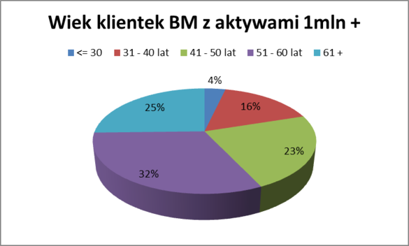 Co drugi klient Banku Millennium (52%) jest kobietą. Kobietą jest również prawie co drugi milioner (41%), czyli klient posiadający w banku więcej niż 1 milion złotych. Średnia wieku klientek banku wynosi 45 lat, a milionerek 52 lata, co szczególnie nie dziwi. Zgromadzenie milionowych aktywów wymaga przecież czasu. Ponad trzy czwarte kobiet z aktywami powyżej 1 mln jest po czterdziestce, a tylko 4% poniżej trzydziestki. Najliczniejszą grupę stanowią zamożne panie między 50 a 60 rokiem życia. Wśród wszystkich klientek Banku Millennium jedna piąta nie ukończyła jeszcze 30 lat. Kobiety rozporządzają majątkiem porównywalnym z majątkiem mężczyzn. Średnie saldo milionerki jest zaledwie o 8% niższe niż saldo milionera, a majątek przeciętnej klientki stanowi 88% średniego majątku mężczyzny.