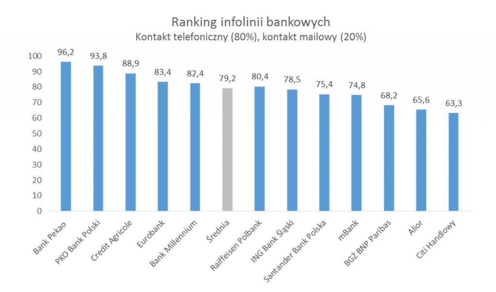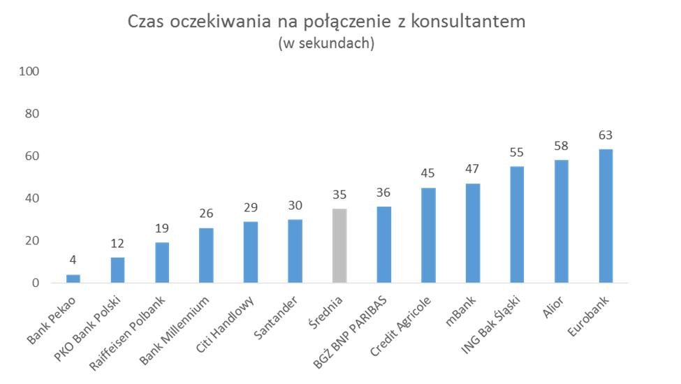 Liderem pod względem czasu oczekiwania na połączenie z konsultantem został, podobnie jak w ubiegłym roku, Bank Pekao. W sześciu bankach czeka się na połączenie dłużej niż jeszcze rok temu, w czterech krócej, a w dwóch czas oczekiwania się nie zmienił. Średnio klienci na infoliniach czekają  o 4 sekundy dłużej niż jeszcze rok temu. Bankiem, który w największym stopniu poprawił swój ubiegłoroczny wynik jest Raiffeisen Polbank – skrócenie czasu oczekiwania na połączenie z konsultantem z 49 sekund do 19.