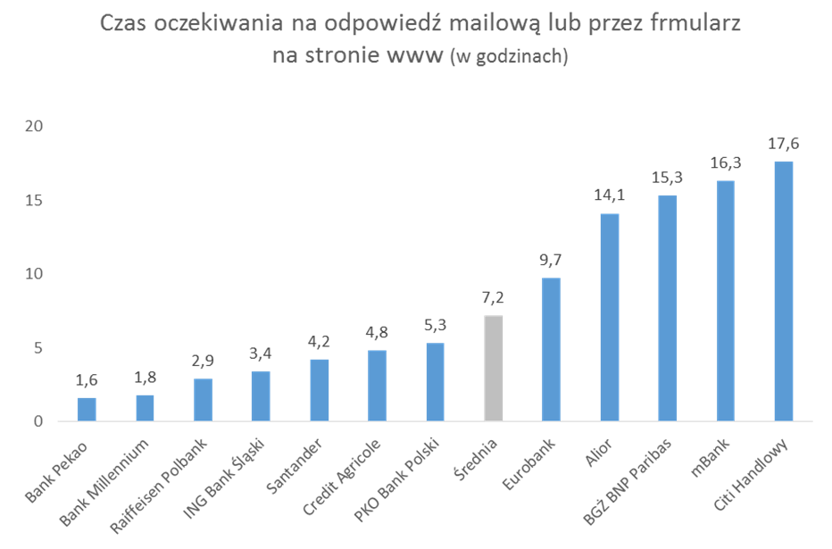 Najkrócej na odpowiedź mailową lub przez formularz na stronie www czeka się w Banku Pekao. Istotnie obniżył się średni czas oczekiwania na odpowiedź – ponad dwukrotnie (z 15,7 h do 7,2 h). Wynika to z istotnego obniżenia czasu oczekiwania w dwóch bankach, w których w zeszłym roku czas oczekiwania był kilkukrotnie wyższy od średniej. W rzeczywistości w siedmiu z dwunastu badanych banków czas oczekiwania na odpowiedź mailową lub przez formularz na stronie www się wydłużył, a w pięciu skrócił.