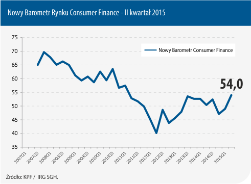 W II kwartale 2015 r. wartość Nowego Barometru Rynku Consumer Finance wzrosła z 49 do 54 punktów. Jest to najsilniejszy wzrost wartości tego wskaźnika od początku 2013 r., a obecnie obserwowana wartość jest najwyższą od 2011 r.