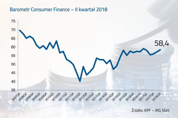 Barometr Rynku Consumer Finance, określany co kwartał w badaniu „Sytuacja na rynku consumer finance” Konferencji Przedsiębiorstw Finansowych oraz Instytutu Rozwoju Gospodarczego SGH, wzrósł w II kwartale 2018 roku z 57,2 do 58,4 punktu. To trzynasty z kolei odczyt tego wskaźnika powyżej 50 punktów, oznaczający spodziewaną dodatnią dynamikę kredytu konsumpcyjnego w nadchodzącym roku.