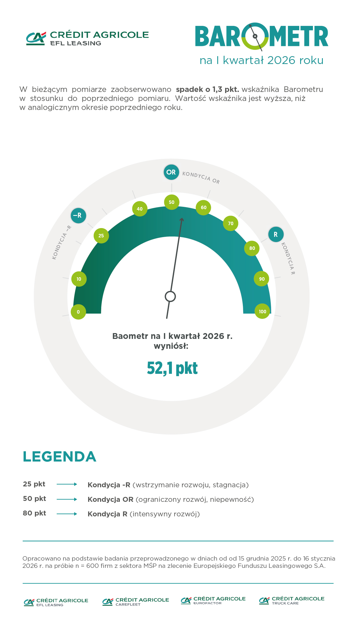 Barometr EFL jest syntetycznym wskaźnikiem informującym o skłonności firm z sektora MŚP do wzrostu (tj. rozwoju rozumianego, jako stawianie sobie przez przedsiębiorstwa celów związanych ze wzrostem sprzedaży i produkcji, ekspansją na nowe rynki i maksymalizacją zysków, co jest związane z inwestycjami w środki trwałe). Prognozowana na dany kwartał kondycja finansowa firm MŚP daje punkt odniesienia do wnioskowania o zakładanym kierunku zmian, które sprzyjają wzrostowi lub działają hamująco na rozwój firm. Badanie przygotowywane jest przez Ecorys na zlecenie Europejskiego Funduszu Leasingowego SA., a jego wyniki są publikowane co kwartał. Jego uczestnicy to mikro, małe i średnie firmy terenu całej Polski. W badaniu wzięła udział reprezentatywna grupa 600 mikro, małych i średnich firm. Aktualna edycja badania odbyła się od 15 grudnia 2025 roku do 16 stycznia 2026 roku.