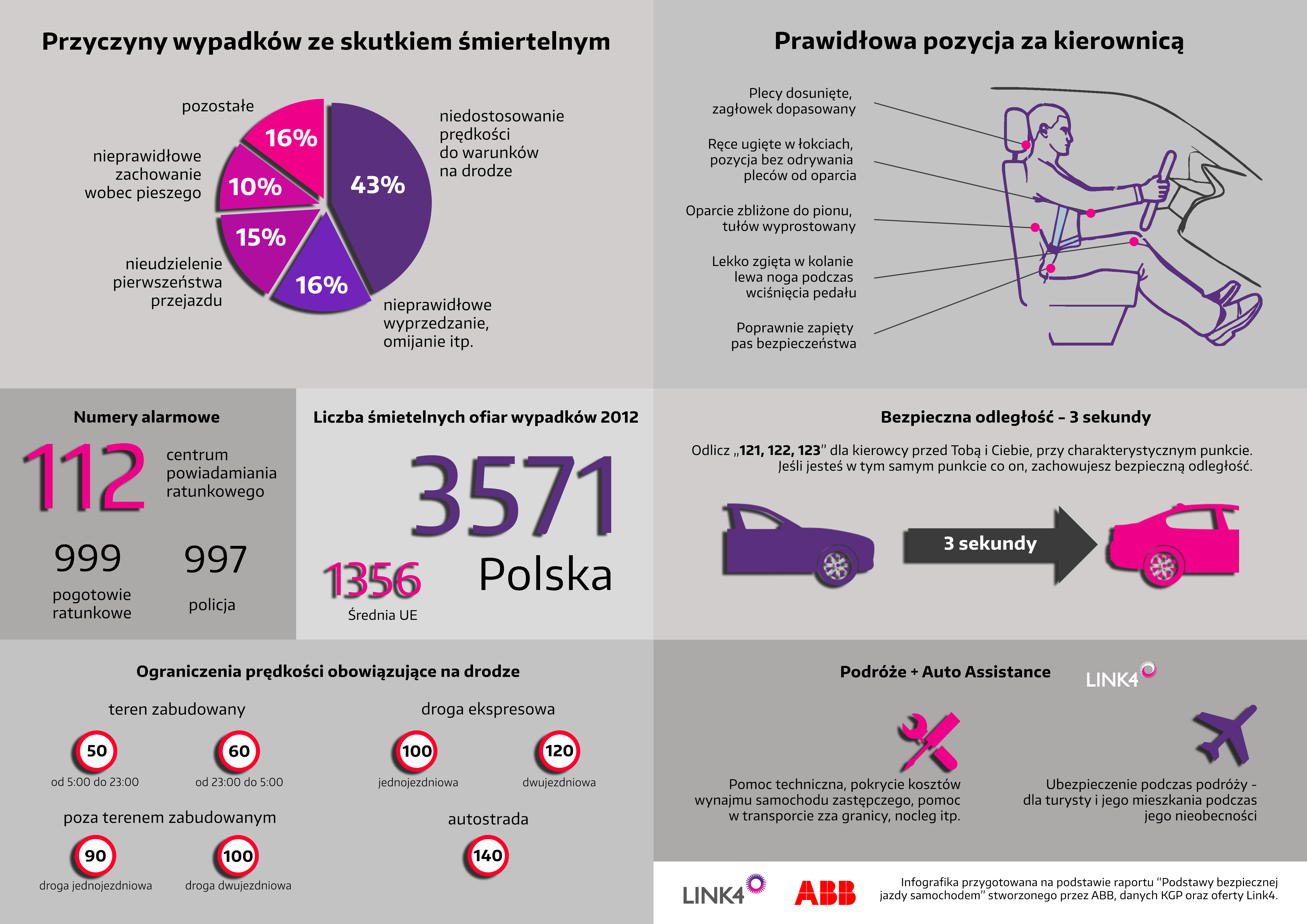 Wspólnie z LINK4 przypominamy o bezpieczeństwie na drodze publikując dane z raportów ABB i KGP. Przystępna forma infografiki zachęca do zapoznania się z informacjami na temat tego, która pozycja za kierownicą jest bezpieczna, jaka odległość od jadącego przed nami samochodu może nam uratować życie oraz jakie ograniczenia prędkości obowiązują na polskich drogach.