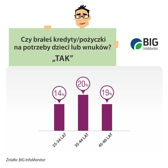Nie zaskakuje w tej sytuacji fakt, że na pytanie czy niejednokrotnie brałeś kredyt lub pożyczkę na potrzeby dzieci lub wnuków twierdząco odpowiedziała co piąta osoba w wieku 35-44 lat, 19 proc. osób w przedziale wiekowym 45-60 lat i 14 proc. wśród rodziców w wieku od 25 do 34 lat.