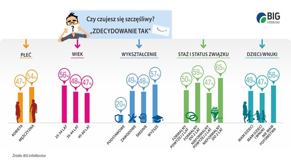 Na pytanie: „Czy czujesz się szczęśliwy?” zadane osobom w związkach formalnych i nieformalnych – zdecydowanie tak – odpowiedziało 56 proc. osób bez dzieci, 49 proc. z dziećmi i 47 proc. posiadających zarówno dzieci jak i wnuki – mówi badanie Instytutu ARC Rynek i Opinia* wykonanego na zlecenie BIG InfoMonitor.
