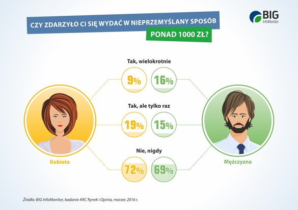 Z badania przeprowadzonego przez Instytut ARC Rynek i Opinia na zlecenie BIG InfoMonitor wynika, że spontaniczne zakupy za co najmniej tysiąc złotych, o których najlepiej chciałoby się później zapomnieć, zdarzyły się 28 proc. kobiet i 31 proc. mężczyzn*.