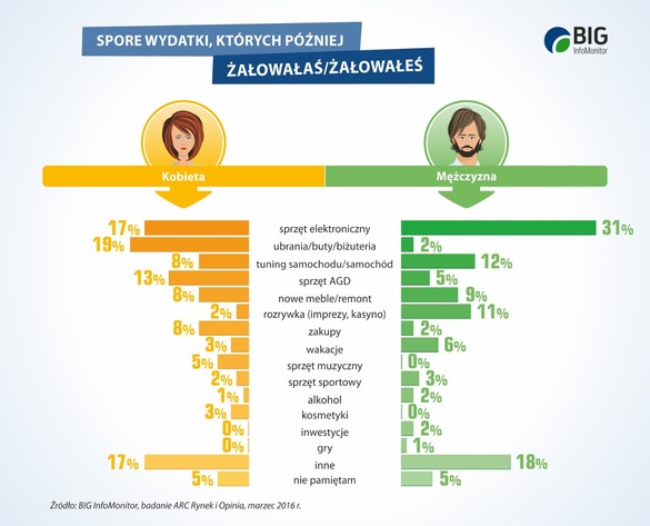 Niemal co trzeciemu Polakowi zdarzyło się w nieprzemyślany sposób wydać większą sumę pieniędzy, której później żałuje – wynika z badania zleconego przez Rejestr Dłużników BIG InfoMonitor. Część popełnia ten błąd regularnie. Panowie tracą głowę dla smartfonów, tabletów, notebooków i telewizorów, a panie, poza sprzętem elektronicznym, również dla ubrań, butów i biżuterii.