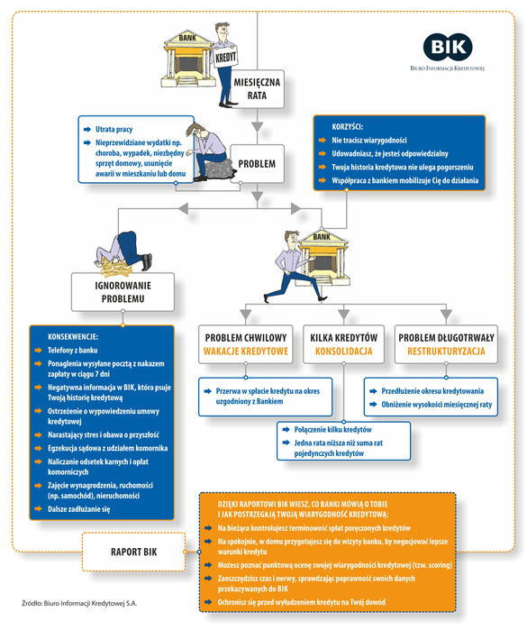 Twoja inicjatywa pokaże kredytodawcy, że nie bagatelizujesz problemu i nie uciekasz od odpowiedzialności. Doradca w banku zaproponuje z pewnością kilka alternatywnych propozycji, które oczywiście nie zlikwidują problemu, ale np. dadzą Ci niezbędny czas na poszukiwanie rozwiązania. Takie sytuacje się zdarzają i właśnie na ich okoliczność banki są przygotowane. Twoja proaktywna postawa sprawi, że nie stracisz wiarygodności w oczach banku, a dodatkowo uchroni Cię od następstw podjęcia ewentualnych działań windykacyjnych ze strony banku. Jednocześnie Twoja historia w BIK nie ulegnie pogorszeniu. Ważne, aby utrzymać stały kontakt z bankiem, w razie konieczności dostarczyć niezbędne dokumenty, a jeśli sytuacja pozwoli, dokonywać płatności nawet jeśli pokrywają tylko część raty.