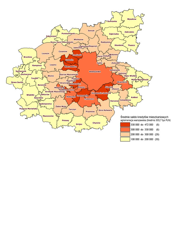 Średnio powyżej 400 tys. złotych na rachunku kredytowym pozostało do spłacenia w aglomeracji warszawskiej mieszkańcom trzech gmin: Konstancin – Jeziornej (471 tys. zł), Podkowy Leśnej (442 tys. zł) i Izabelina (402 tys. zł). Sami warszawiacy są winni dużo mniej – średnio 329 tysięcy.