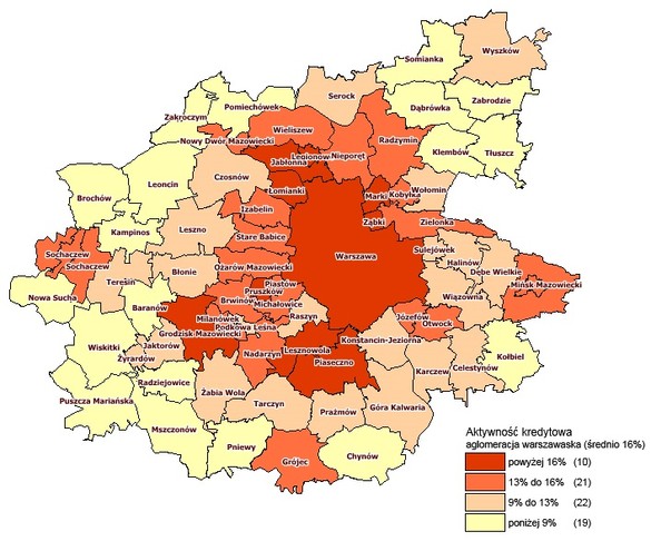 Aglomerację warszawską zamieszkuje 2,5 mln dorosłych Polaków, z których 405,3 tys. posiada czynny kredyt mieszkaniowy. W samej Warszawie – centrum aglomeracji mieszka 58% mieszkańców obszaru metropolitalnego. Aktywność kredytowa w aglomeracji warszawskiej mierzona odsetkiem mieszkańców gminy posiadających kredyt mieszkaniowy jest wysoka w Warszawie oraz niektórych pobliskich gminach, zwłaszcza na południowy zachód i północny wschód od Warszawy. Najwyższy poziom tak mierzonej aktywności kredytowej (ponad 20%), występuje w gminach: Piaseczno, Lesznowola, Jabłonna, Ząbki. Wysoka aktywność kredytowa występuje także w gminach (miejskiej i wiejskiej) Mińska Mazowieckiego. Poziom aktywności w samej Warszawie jest nieco niższy – 18% jej mieszkańców obsługuje taki kredyt.
