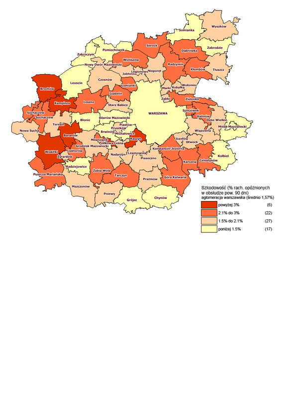 Generalnie wyższa szkodowość kredytów mieszkaniowych występuje na obrzeżach aglomeracji warszawskiej, gdzie najczęściej jest również niska aktywność kredytowa. Najniższa jakość kredytów mieszkaniowych wyróżnia mieszkańców trzech gmin – Kampinosu, Brochowa, Wiskitek.