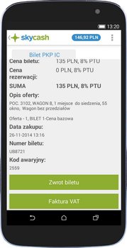 Bilety PKP Intercity są dostępne z poziomu głównego ekranu aplikacji. W jego centralnej części znajduje się ikona z logiem przewoźnika, której dotknięcie uruchamia wyszukiwarkę połączeń. Po określeniu daty wyjazdu oraz stacji początkowej i końcowej wystarczy zdefiniować parametry, np. liczbę biletów, rodzaj zniżki czy klasę wagonu. Ostatni krok to wybór metody płatności (konto SkyCash lub karta płatnicza) i zatwierdzenie transakcji. Bilet zostaje automatycznie zapisany w zakładce „Kontrola” i można okazać go konduktorowi nawet bez późniejszego dostępu do Internetu. Pasażer może też w prosty sposób zrezygnować z zakupionego biletu. Środki zostaną wtedy zwrócone na konto SkyCash lub powiązaną z nim kartę płatniczą, wykorzystaną do zakupu. Osoby odbywające podróż służbową mogą generować faktury VAT, które są wysyłane na wskazany adres e-mail.