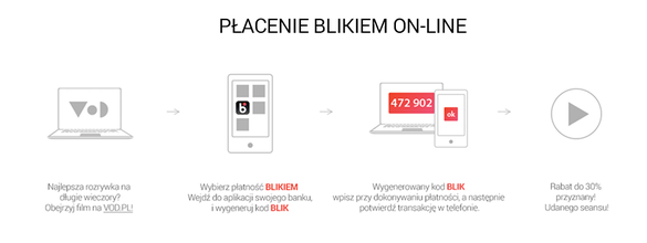 Wszyscy użytkownicy BLIKA mają teraz łatwiejszy dostęp do wybranego filmu z VOD.pl. Mogą oni bowiem zapłacić za dowolny materiał wideo bezpośrednio na stronie VOD.pl. Płatność BLIKIEM jest udostępniona od razu na stronie, gdzie można wprowadzić kod BLIK do wykonania transakcji. Po wprowadzeniu kodu natychmiast uzyskujemy dostęp do filmu. BLIK umożliwia płacenie online bez dodatkowych przekierowań i ekranów transakcyjnych oraz podawania danych wrażliwych, pozostając cały czas na stronie VOD.pl. Wystarczy jedynie potwierdzenie transakcji w mobilnej aplikacji bankowej. Jest to bardzo szybka i bezpieczna metoda płatności w internecie, nie wymagająca żadnych innych rejestracji.