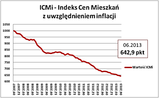 W czerwcu po raz kolejny spadła również wartość Indeksu Cen Mieszkań uwzględniającego inflację (ICMi). Choć w porównaniu z majem wskaźnik inflacji był zerowy to wartość ICMi była o 3,7 pkt. niższa i wyniosła 642,9 pkt.