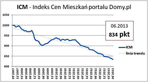 Niewielki popyt na rynku nieruchomości ograniczony dodatkowo przez nastanie okresu urlopowego znajduje odzwierciedlenie w najnowszym odczycie Indeksu Cen Mieszkań portalu Domy.pl. W porównaniu z majem br. wartość ICM w czerwcu była o 4,8 pkt. niższa i wyniosła 834 pkt. W porównaniu z czerwcem 2012 wartość ICM spadła o 37,4 pkt., tj. 4,3%.