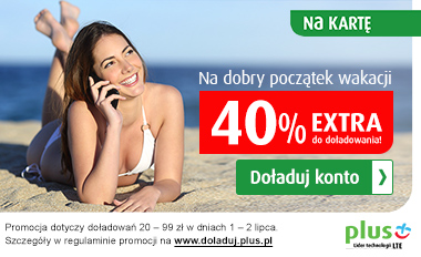„Celebrujemy wakacje” to nowa promocja dla klientów usług „na kartę” w Plusie, którzy w dniach 1-2 lipca doładują swoje konto przez strony internetowe za 20-99 zł. Otrzymają oni bonus 40% wartości doładowania do wykorzystania na wszystkie dostępne usługi telekomunikacyjne: rozmowy, SMSy, MMSy, Internet.