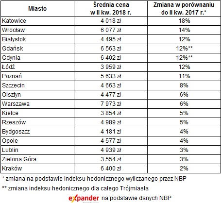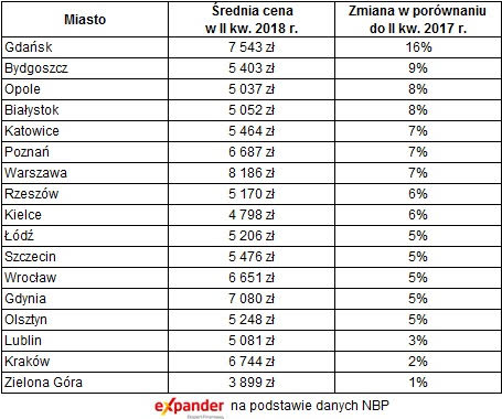 Według najnowszych danych NBP w Białymstoku, Rzeszowie i Opolu średnia cena transakcyjna nowych mieszkań przekroczyła już psychologiczną granicę 5000 zł za m2. W Warszawie po raz pierwszy od 7 lat pokonała poziom 8000 zł. Z kolei na rynku wtórnym uwagę zwraca fakt, że aż w siedmiu miastach ceny w ciągu minionych 12 miesięcy rosną o ponad 10%. Zdaniem Expandera na spadki cen trzeba będzie natomiast zaczekać kilka lat. W przyszłości mogą wywołać je dopiero podwyżki stóp procentowych lub znaczące pogorszenie koniunktury gospodarczej i wywołany nią istotny wzrost bezrobocia.