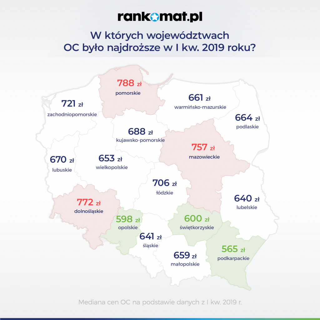 Na początku 2019 r. najwięcej za ubezpieczenie OC płacili kierowcy z województw: pomorskiego (788 zł), dolnośląskiego (772 zł) i mazowieckiego (757 zł). Na najniższe składki mogli natomiast liczyć kierowcy z województw: podkarpackiego (565 zł), opolskiego (598 zł) i świętokrzyskiego (600 zł).