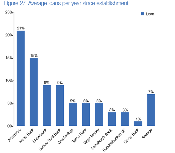 Pionierskim, powstałym od zera „challengerem”, któremu w 2010 roku udało się uzyskać pełną licencję bankową był Metro Bank (była to pierwsza licencja od 150 lat – co chyba najlepiej pokazuje skostnienie brytyjskiej bankowości!). Od tamtej pory zgodę brytyjskiego regulatora na prowadzenie działalności bankowej uzyskało sześć nowych instytucji, a chęć ubiegania się o licencje wyraziło kolejnych 30 podmiotów. Pięć banków-pretendentów – Shawbrook, Virgin Money, TSB, OneSavings Bank i właśnie Aldermore – już jest notowanych na londyńskiej giełdzie. Kapitalizacja giełdowa Aldermore, który zadebiutował w marcu tego roku, wynosi obecnie ok. 650 milionów funtów.