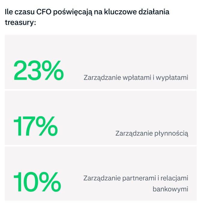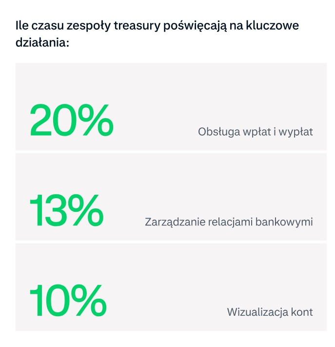Złożoność operacyjna zmusza działy finansowe do poświęcania znacznej ilości czasu na zadania o niskiej wartości dodanej. Zgodnie z wynikami badania „Treasury Report” zespoły spędzają 10 proc. swoich zasobów na wizualizacji rachunków, 13 proc. na zarządzaniu relacjami bankowymi i ponad 20 proc. na obsłudze płatności przychodzących i wychodzących. Konsolidacja systemów zarządzania środkami mogłaby znacząco ograniczyć czas poświęcany na te zadania.